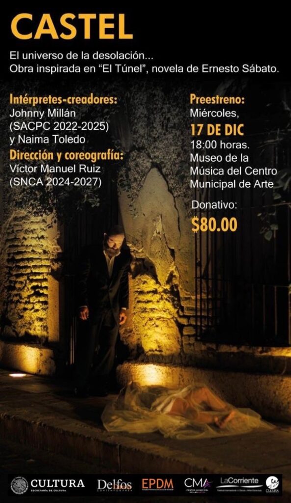Mazatlán, Sinaloa, 15 de diciembre de 2025.– Este miércoles 17 de diciembre a las 18:00 horas se invita al público a asistir al preestreno de la obra dancística-teatral «Castel», una profunda adaptación de la aclamada novela «El Túnel» (1948) del escritor argentino Ernesto Sábato.