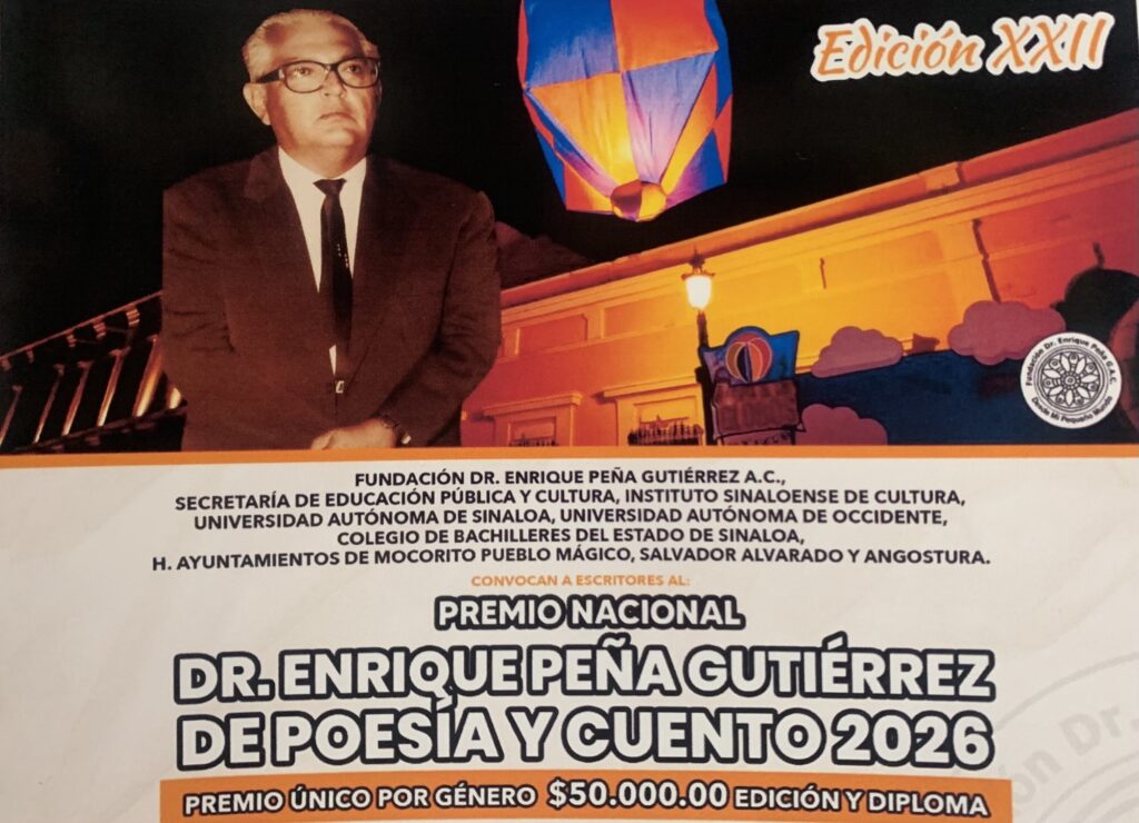 Culiacán, Sin.- La Fundación Dr. Enrique Peña Gutiérrez A.C. mantiene abierta la convocatoria a escritores de todo el país que deseen participar en la edición 22° del Premio Nacional Dr. Enrique Peña Gutiérrez de Poesía y Cuento, con un premio único por 50 mil pesos y diploma en cada género.