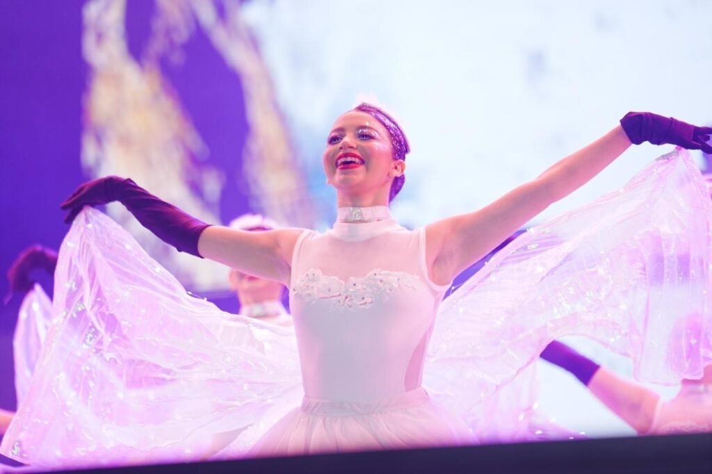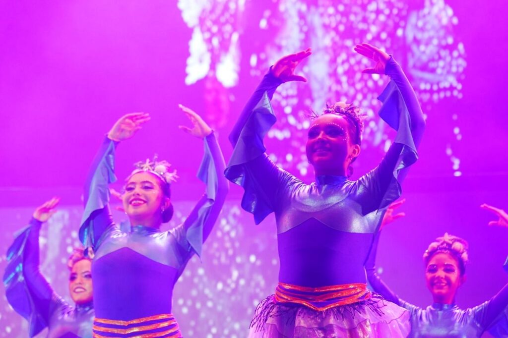 Telas en gamas de azul profundo ondulaban como marejada mansa; los cuerpos infantiles dibujaban corrientes marinas; las coreografías respiraban al ritmo del vaivén. La fantasía no era artificio: era memoria disfrazada de juego.