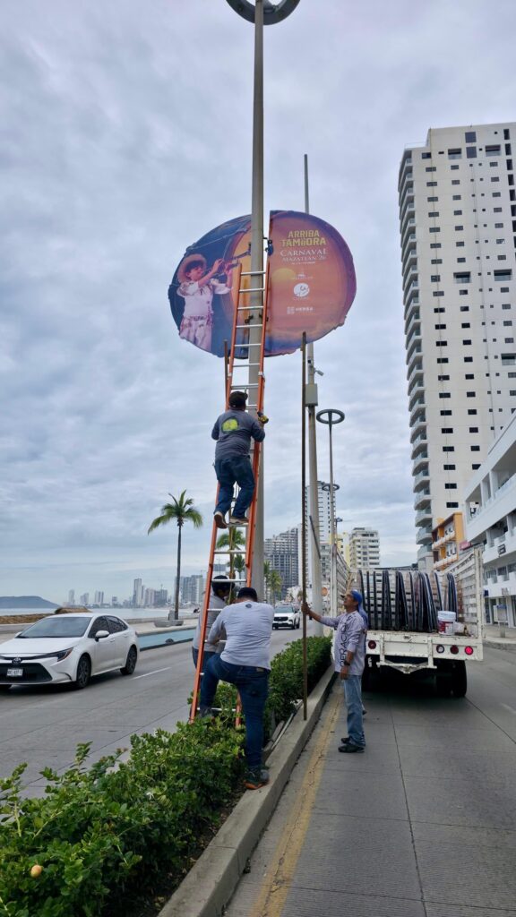 Mazatlán, Sinaloa, 17 de enero de 2026.– Desde las primeras horas de este sábado, el equipo de Operaciones del Instituto Municipal de Cultura, Turismo y Arte finalizó la instalación de la avanzada publicitaria del Carnaval Internacional Mazatlán 2026 con los pendones oficiales bajo el lema: “¡Arriba la Tambora!”.