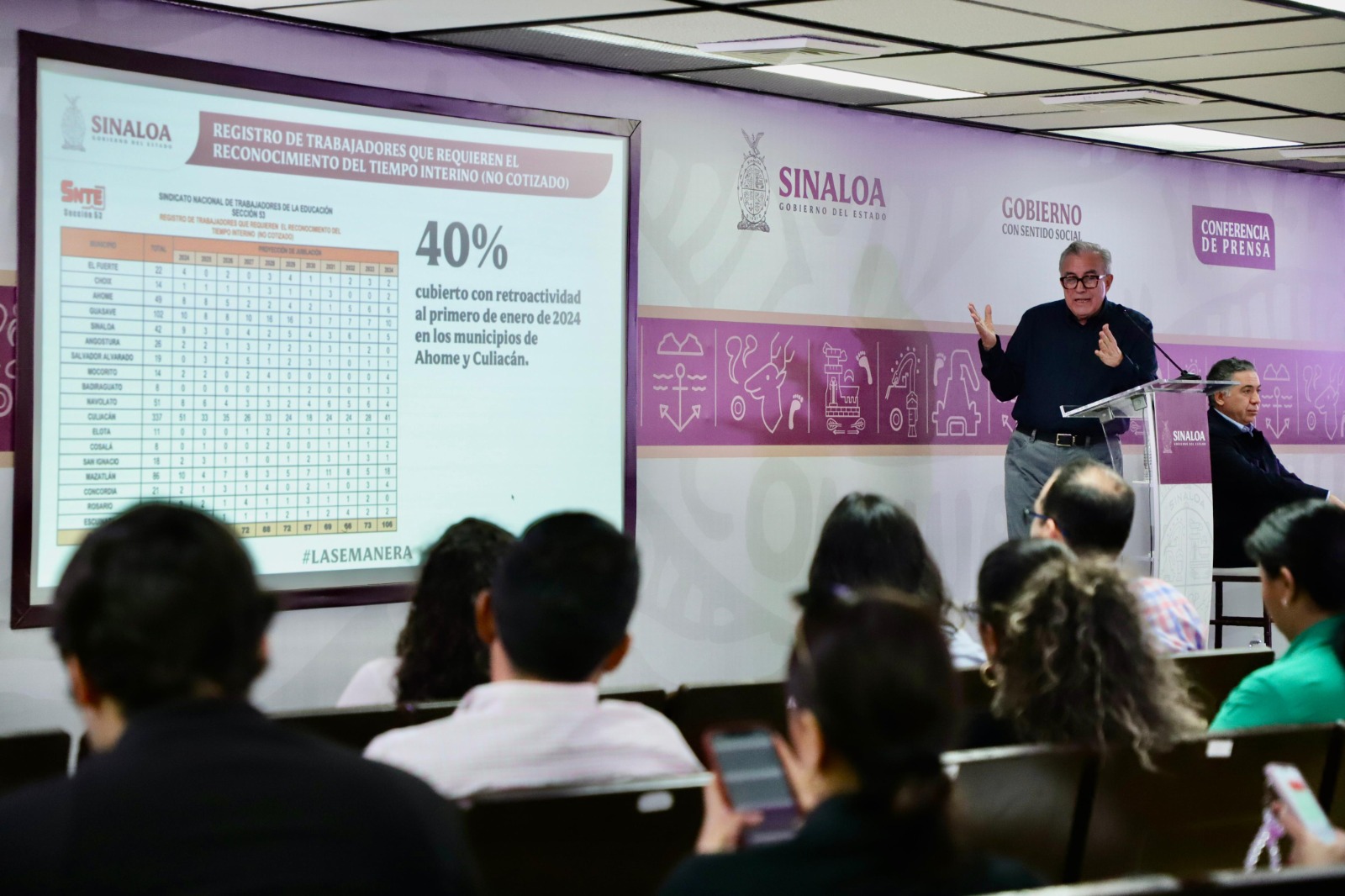 Lo que hicimos fue acordar con el sindicato que a las profesoras, a los profesores, que son del estado y que trabajan en Culiacán municipio, se les va a homologar, con los que trabajan de aquí para Mazatlán y también a los de Ahome, porque son los dos que no tenían, ¿Cuánto representa? Una cantidad importante, pero acorde con el sindicato que se los iba a ir dando, 20 por ciento por año, para que cuando termine mi administración tengan ellos ya el 100 por ciento, ya la rezonificación», agregó Rocha Moya.