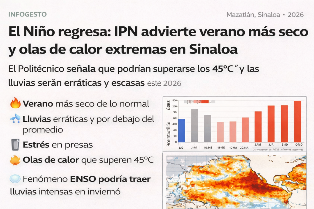 Mazatlán, Sinaloa, 2 abril 2026— El Instituto Politécnico Nacional (IPN) alertó sobre la inminente llegada de la fase cálida del fenómeno ENSO (El Niño), que podría impactar de forma directa a Sinaloa con menos lluvias, calor extremo y presión sobre presas durante 2026.