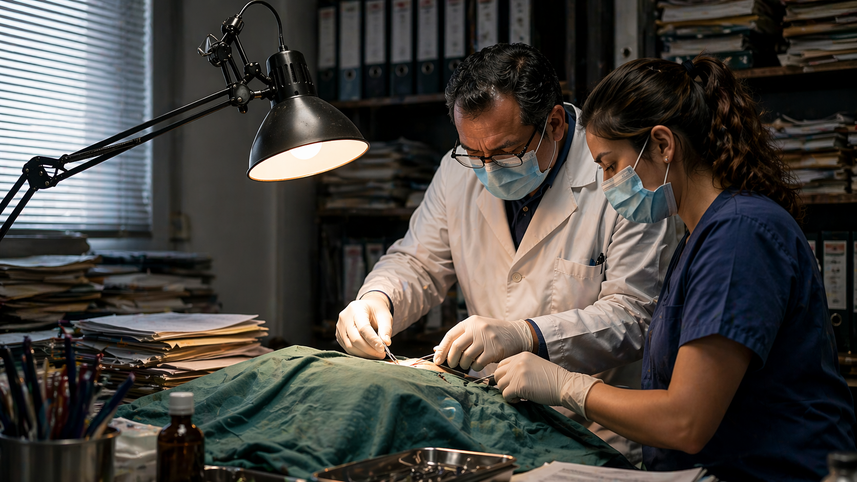 La operación ocurrió en una oficina que hacía las veces de quirófano: expedientes amarillentos, archiveros grises, una lámpara de dibujante como única iluminación y un escritorio mesa quirúrgica. El médico -una especie de rockstar del bisturí- alternaba precisión con humor, como si la intervención requiriera más ritmo que protocolo. A su lado, una joven pasante en su primera faena, sostenía el instrumental con más fe que experiencia.