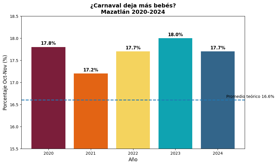 - Si los nacimientos se distribuyeran de manera uniforme en el año, dos meses concentrarían aproximadamente 16.6% del total anual. En Mazatlán, octubre y noviembre concentran entre 17.2% y 18% cada año.