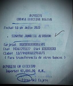 La denuncia no proviene de empleados anónimos, sino de una fuente de alta credibilidad, cuya trayectoria profesional le permite conocer a profundidad la operación registral y sus rutas formales e informales. Entregó a Paralelo 23 una fotografía con dos elementos: una nota escrita a mano con el texto “BanCoppel – $1,000 – 4169…6501” y un recibo oficial de depósito —realizado el 15 de julio de 2023— a nombre de Sinayka Jannette Alvarado, supuesta empleada del Registro Público.