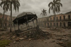 En el Centro Histórico, el kiosco de la plazuela Machado, ícono del puerto, fue arrancado de su base, mientras los edificios alrededor contemplaban erguidos la destrucción, resistiendo el embate del viento que sopló con furia durante más de una hora. Las casas de las calles Constitución, Sixto Osuna, Carnaval y Belisario Domínguez, construidas en el siglo XIX, permanecieron firmes, aunque con severos daños estructurales.