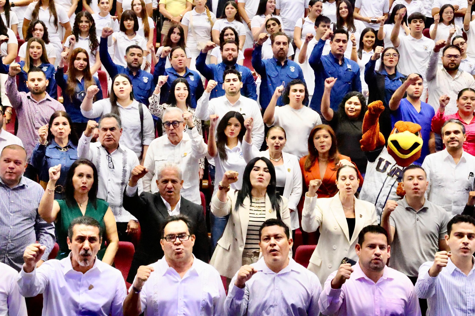 El mandatario estatal fue recibido de manera entusiasta por miles de universitarios, alumnos, docentes y trabajadores administrativos en el Auditorio de la Autonomía Universitaria del Campus Buelna, donde llegó acompañado por el rector de la UAS, Madueña Molina, y demás autoridades universitarias.